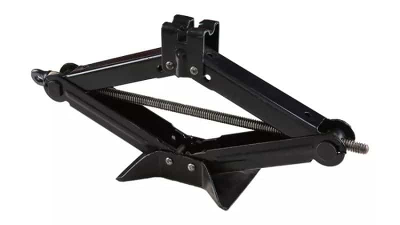 A scissor jack is a mechanical car jack often included with most passenger vehicles. It works by turning a screw, which pulls its arms together and raises the center. Its simple design and small size make it easy to store in a trunk.